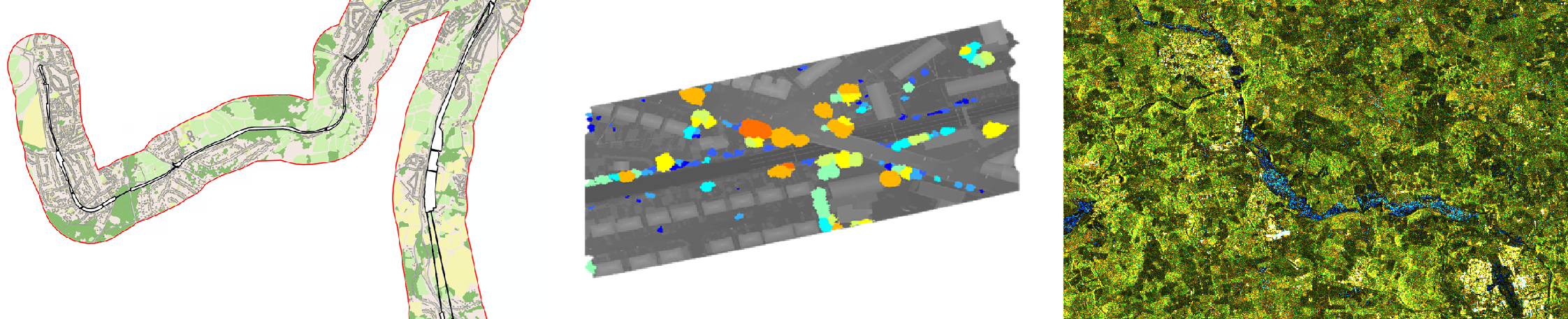 Left: Example of rail-adjacent land cover derived from satellite imagery produced within the ESA-funded LUCI project. Centre: Tree-risk based on LiDAR data. Within RAVE, the potential of ROSE-L derived tree height will be explored for the purpose of hazard mapping. Lidar image courtesy of Network Rail, 2022. Right: Sentinel-1A dual-pol image composite dated 18th Nov 2021, showing flooding (blue) in Aberdeenshire, Scotland. Image credit: contains modified Copernicus Sentinel data (2017), processed by Airbus Defence & Space UK Ltd. Courtesy of Airbus Defence and Space Ltd.