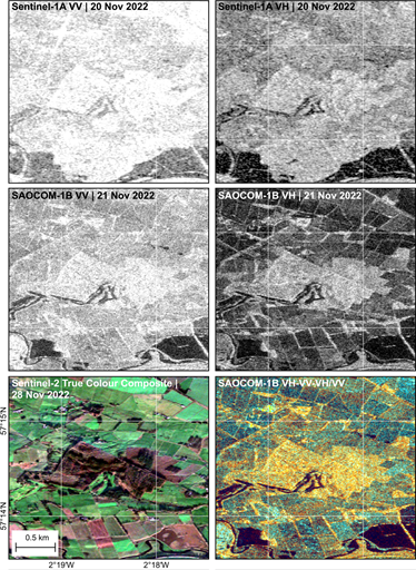 In terms of initial impressions, we deem the L-band imaging capabilities of SAOCOM-1A and SAOCOM-1B to be excellent. Consistent with SAR theory [3], this is especially true over heavily vegetated (woodland and hedged) regions viewed in cross-polarisation (HV, VH) mode (Figure 2), and across inundated regions where backscatter returns tend to be low due to specular reflection over standing water. Together, these findings are encouraging for the tree height-, flood detection- and other ROSE-L-enabled applications to be developed as part of the SUP1 RAVE project.
